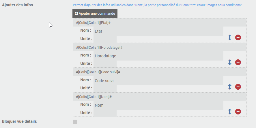 Nom de l'équipement : Colis 1 Commandes : - Nom (type info / Autre) - Etat (type info / Autre) - Horodatage (type info / Autre) - Code suivi (type info / Autre) - Suppression suivi colis (type action/binaire) et la commande info associée Suppression suivi colis (valeur) - Transporteur (type action/liste) et la commande info associée Transporteur (valeur)