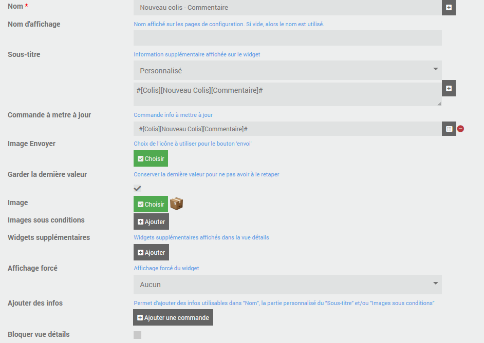 Il vous faudra adapter toutes les lignes “JeedomConnectWidget::updateConfig(XXX, 'enable' ,…” afin de remplacer les XXX par les ID des widgets JeedomConnect Colis 1 à 6 et Supp colis 1 à 6 que vous avez créé. Tous les widgets qui ne sont pas associés à un colis seront désactivés (invisible sur l'interface JeedomConnect) et ne s'activeront que lorsqu'un colis y sera associé.