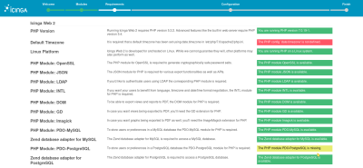 Sur cette page, Icinga va vérifier que vous ayez les pré-requis nécessaire au bon fonctionnement du logiciel. Pour ma part j’avais l’erreur The PHP config `date.timezone' is not defined. et le warning The PHP module PDO-PostgreSQL is missing. Comme j’utilise une base de donnée mysql, je n’ai pas besoin du module PostgreSQL, mais j’ai besoin de corriger l’erreur de la timezone.